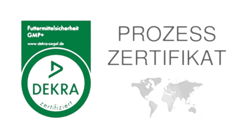 Unser Prozess: Handel mit Einzelfuttermitteln entspricht den allgemeinen Anforderungen und Voraussetzungen des Standards: GMP+ B3 „Handel, Erfassung, Lagerung und Umschlag“ des GMP+ - FC Schemas der GMP+ International.